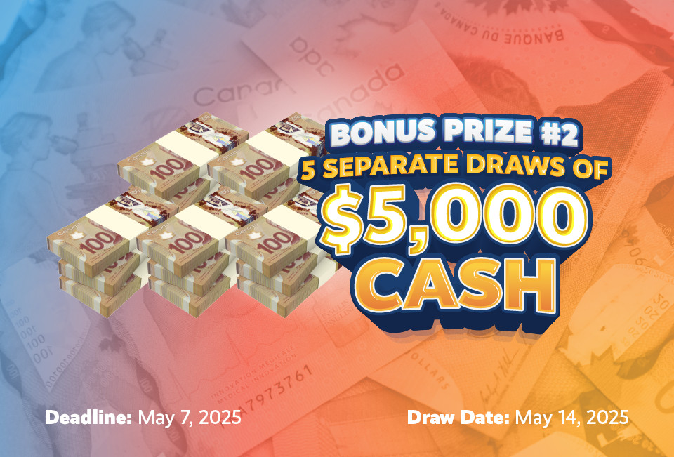 This year, with our Bonus #2 prize – you have a chance to win one of five separate draws of $5,000 cash each!